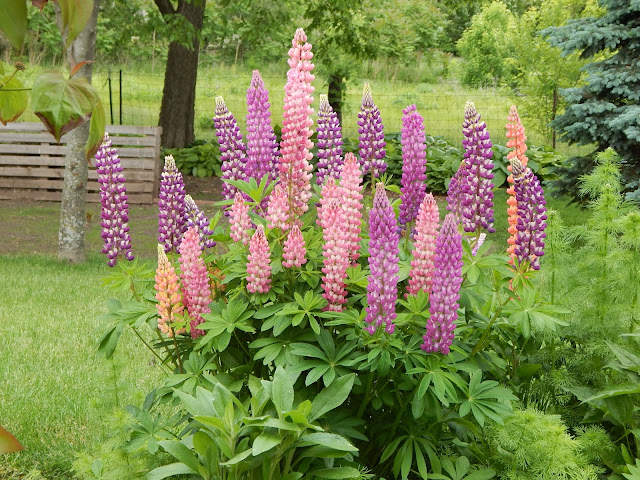 Here is Lupin Corner. This is an image from this spring. The area now could just as well be called Larkspur Corner or Coneflower Corner, as those are what are blooming there in July. Love my lupins!